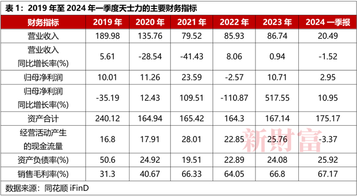 同花顺iFinD数据显示,2019年至2024年一季度,天士力除了2022年录得2.57亿元亏损,其余年份均盈利超过10亿元;销售毛利率从2021年至今一直维持在64%以上;2020年至今,其资产负债率仅在20%左右(表1)。粗略来看,天士力业绩总体不错。