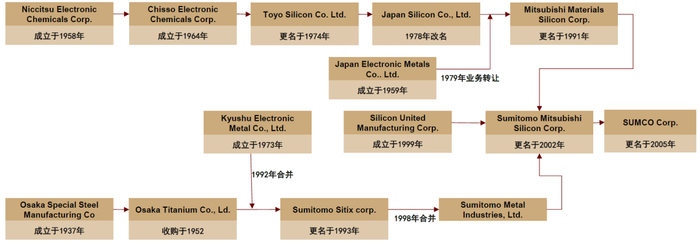 注:① 1999年7月,住友金属工业株式会社、三菱综合材料株式会社及三菱综合材料硅株式会社共同出资成立了专门开发和生产300毫米硅晶圆的公司——Silicon United Manufacturing Corp。②2002年2月,Silicon United Manufacturing Corp. 从住友金属工业公司手中收购了硅晶圆业务,并与三菱材料硅公司合并,同时将其商号更改为住友三菱硅公司