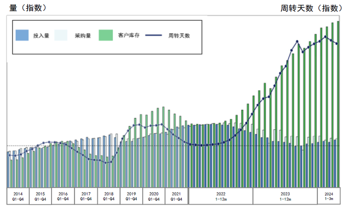 从半导体材料库存周期来看,我们以硅片为例,由于硅片存在标准化、便于长期存储的特点,晶圆厂通常会在需求旺盛时进行备货,导致硅片成为下游库存周期最长的半导体材料之一。自2022年下半年以来终端消费电子等领域需求不足,导致晶圆厂产能利用率出现下滑,造成下游晶圆厂库存持续高企。根据SUMCO FY1Q24业绩说明会,截至2024年3月客户端的300mm硅片库存水位仍在增加,但库存周转天数自2H23开始基本稳定、1Q24已开始逐步下降,硅片需求有望进入恢复阶段。