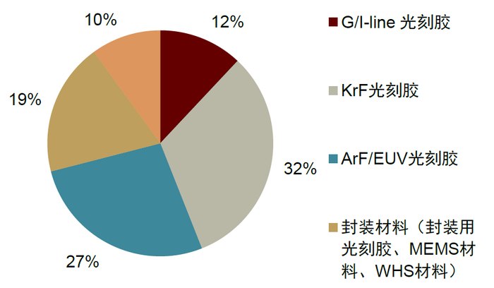 分拆来看,EUV光刻胶通常用于7nm以下先进制程,随着先进制程与先进封装渗透率的提升,EUV光刻胶在光刻胶中的占比也将随之提升。据TECHCET预测,随着先进制程及存储器资本开支增加,EUV及KrF光刻胶呈显著增长,G/I线光刻胶的市场空间趋于饱和,未来占比将逐年减少,整体结构性变化较大。2023年EUV光刻胶占比约为6%,2025年EUV光刻胶市场占比提升至10%。