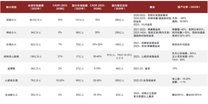 老龄化患病群体不断扩大,高耗市场规模维持双位数以上增长。根据《中国心血管疾病与健康报告2022》,我国心血管病现患人数3.3亿,其中脑卒中1300万人,冠心病1139万人,心力衰竭890万人,外周动脉疾病4530万人,高血压2.45亿人。微创介入手术比外科手术更安全,比药物更有效,在技术升级+国产替代的东风下,渗透率持续提升,手术量快速增长。我们预计神经介入、外周介入、心脏电生理、结构性心脏病介入等领域的中国市场规模2023-2026E分别有15-40%左右CAGR,而相对成熟的冠脉介入等也有双位数左右增速。`