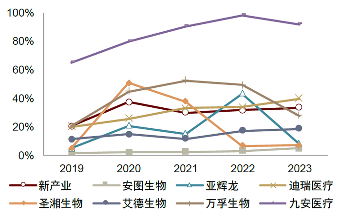 国产品牌海外装机快速提升,有望带动后续试剂产出。以化学发光为例,国产品牌新产业2023年公司实现海外销量3,564台,其中,中大型装机占比由2021年的19.3%提升至2023年的56.7%;国产特色品牌亚辉龙2023年在海外市场新增化学发光仪器装机超过684台,其中300速及600速化学发光仪器新增装机72台,同比增长500%。