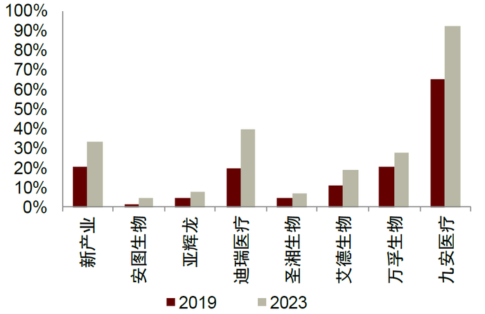 出海方兴未艾,海外收入占比提升趋势明显。根据各公司公告,一部分公司由于疫情期间出口大量新冠检测相关试剂盒造成表观海外收入占比呈现先升后降的态势,但整体来看,对比2019年和2023年各国产体外诊断龙头品牌的海外收入占比,均呈现一定程度的提升。