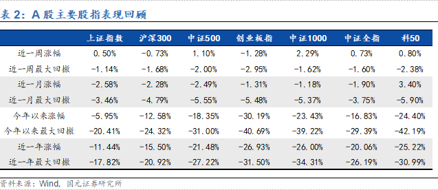 宽基指数表现(近一周/今年以来):上证指数(0.50%、-5.95%)、沪深300(-0.73%、-12.58%)、中证500(1.10%、-18.35%)、创业板指(-1.28%、-30.19%)、中证1000(2.29%、-23.43%)、科创50(0.80%、-24.40%)。