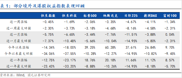 主要权益指数近一周表现:恒生指数(-0.45%)、恒生科技(-1.69%)、标普500(-2.06%)、纳斯达克(-3.35%)、日经225(-4.67%)、德国DAX(-4.11%)、富时100(-1.34%)。