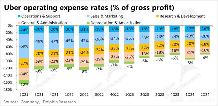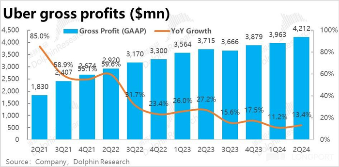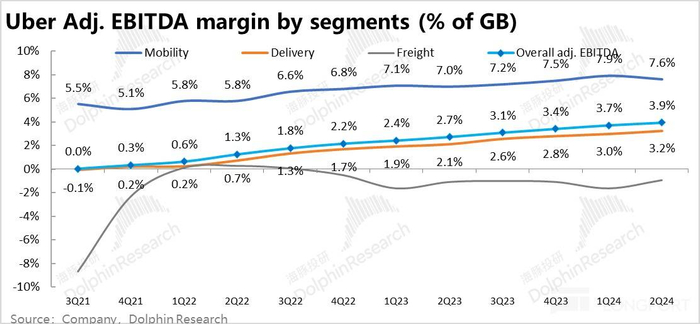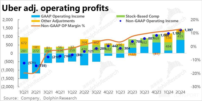但不看预期差,虽然总费用金额已重新增长,但依旧属于被更快的收入增长摊薄的趋势内。加回股权激励和其他非现金支出的调整后,Uber 本季调整后的经营利润为近$14 亿。调整后经营利润率达 13.1% 较上季提升了 1.3pct。