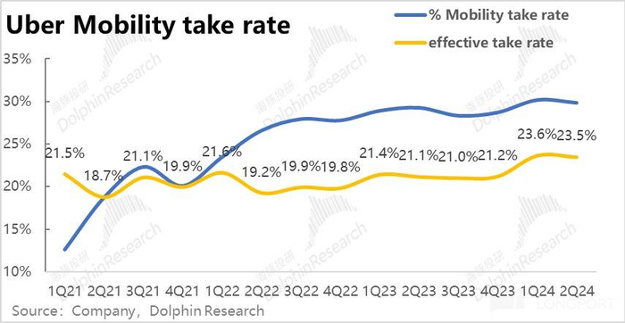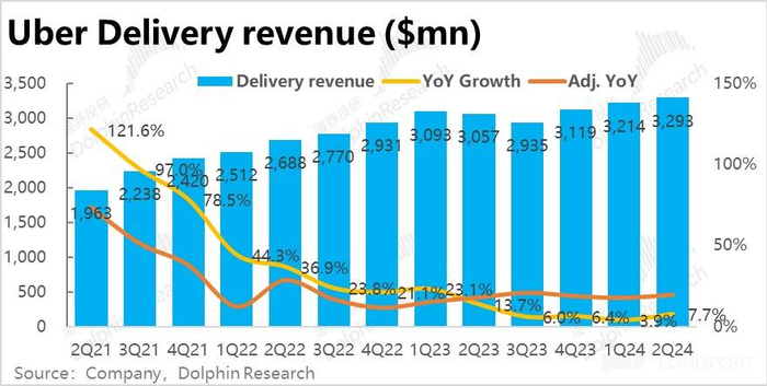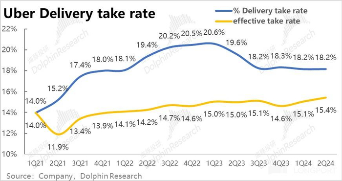 外卖业务本季的收入为 32.9 亿,同比增长 8%,较上季提速了 4pct。收入加速增长,主要归功于变现率的走高。剔除 1P、3P 模式变更的影响,本季的可比变现率为 15.4% 较上季提高了 0.3pct。海豚投研认为,外卖业务变现率的走高,主要是归功于 Uber 广告业务的增长。据公司披露,广告收入目前的年化收入已达$10 亿,