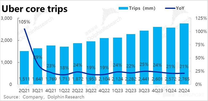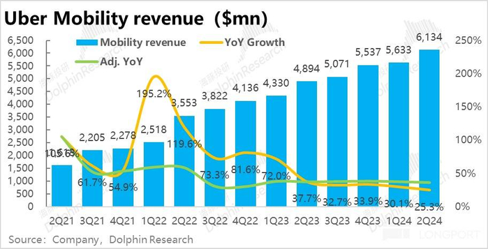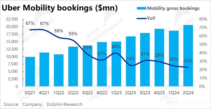 最反映真实经营状况的订单额指标(GTV)上,基石的打车(Mobility)业务,本季订单金额约 206 亿比预期略高 1%。同比增速为 22.9%,看似比上季度继续放缓 1.7pct但实际剔除美元升值的拖累后,恒定汇率下增速为 27%,环比反而提升了 1pct。