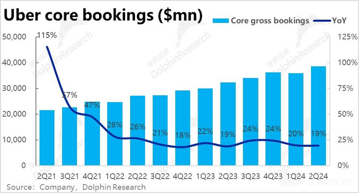 由于 Uber 在英国和加拿大等地区的部分业务因法律原因,从平台型转变为自营模式,公司确认的营收也从净佣金变为总付款金额,导致营收有所放大,因此下文多数都从剔除会计变更影响后的表现来分析。