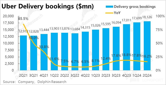 类似的Uber eats 外卖业务本季订单金额约 181 亿元,和预期基本一致同比增长了 17.8%,虽也看似环比放缓了 1.6pct,但剔除汇率影响后,实际增速是环比持平的。换言之,Uber 的外卖也未出现放缓的迹象。