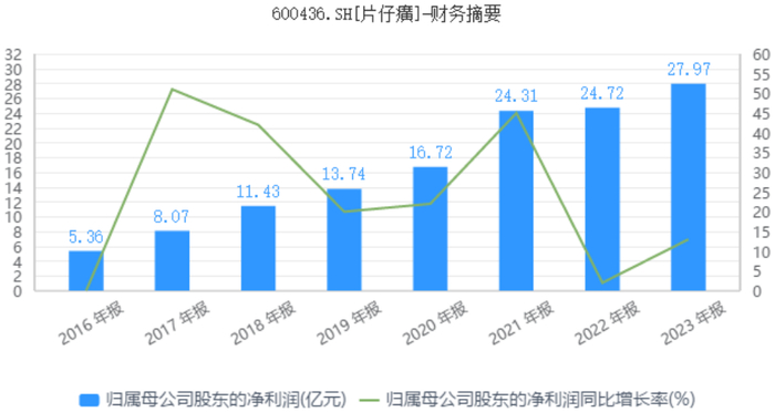 随着产品零售价格的不断增长,片仔癀经营业绩也在一路增长。2016年-2021年期间,片仔癀净利润由5.36亿元增长至24.31亿元,五年内净利润接近翻了5倍,进而带动公司市值一度逼近3000亿元,成为A股中市值最高的中药公司。