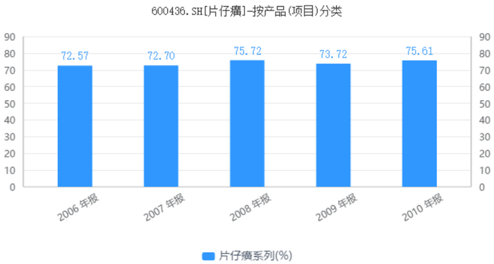 配方的绝密性和材料的稀缺性,让片仔癀有了双重的护城河,同时也给了其不断涨价的底气。历年年报数据显示,2006年-2010年,片仔癀主营业务中“片仔癀”系列产品毛利率维持在75%上下。2016年,片仔癀肝病用药(主要是片仔癀产品)毛利率提升至87.96%,盈利能力稳步显著提升,这也让片仔癀有了“药中茅台”的美誉。