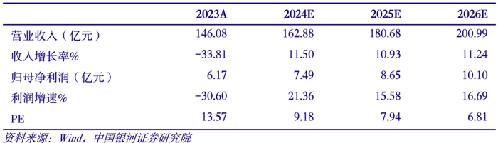 预计2024-2026年,公司分别实现营收162.88亿元/180.68亿元/200.99亿元,同比+11.50%/+10.93%/+11.24%;实现归母净利润7.49亿元/8.65亿元/10.10亿元,同比+21.36%/+15.58%/+16.69%;EPS分别为0.57元/0.66元/0.77元,对应PE为9.18倍/7.94倍/6.81倍。维持“推荐”评级。