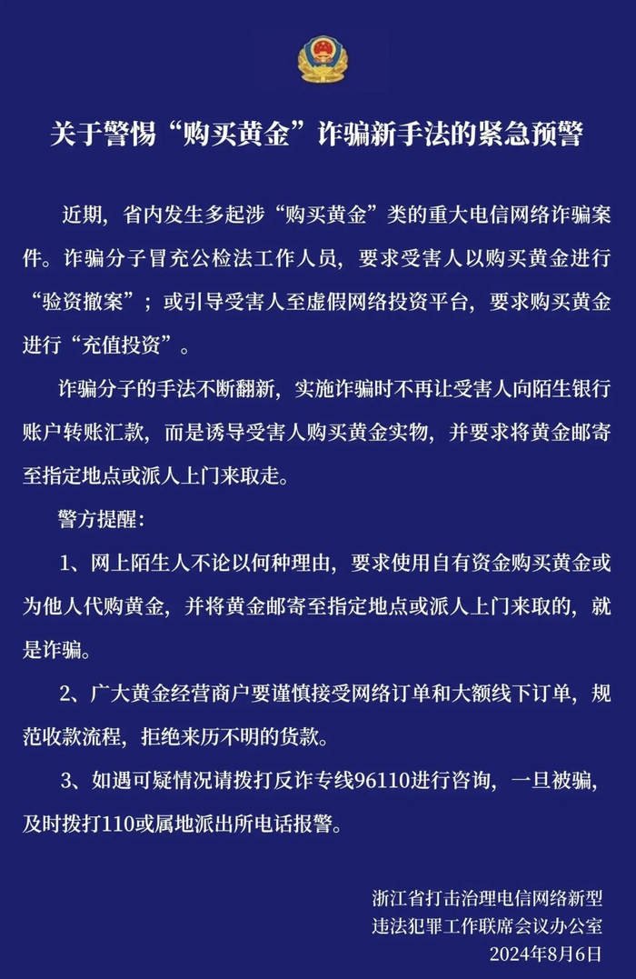 8月6日,浙江省打击治理电信网络新型违法犯罪工作联席会议办公室发布了关于警惕“购买黄金”诈骗新手法的紧急预警。