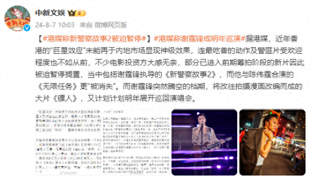 据港媒,近年香港的“巨星效应”未能再于内地市场显现神级效果,连最吃香的动作及警匪片受欢迎程度也不如从前,不少电影投资方大感无奈,部分已进入前期筹拍阶段的新片因此被迫暂停搁置,当中包括谢霆锋执导的《新警察故事2》,而他与陈伟霆合演的《无限任务》更“被消失”。而谢霆锋突然腾空的档期,将改往拍摄漫画改编而成的大片《镖人》,又计划明年展开巡回演唱会。