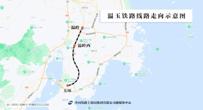 温玉铁路位于浙江省台州市南部,行经温岭、玉环两市。线路自杭台高铁温岭站引出,经温岭市温峤镇、坞根镇、城南镇和玉环市清港镇、楚门镇、龙溪镇,止于芦浦镇玉环站,设温岭、温岭西、玉环3座车站,设计时速350公里,新建正线约37.17公里,其中温岭境内约21.02公里,玉环境内约16.15公里。