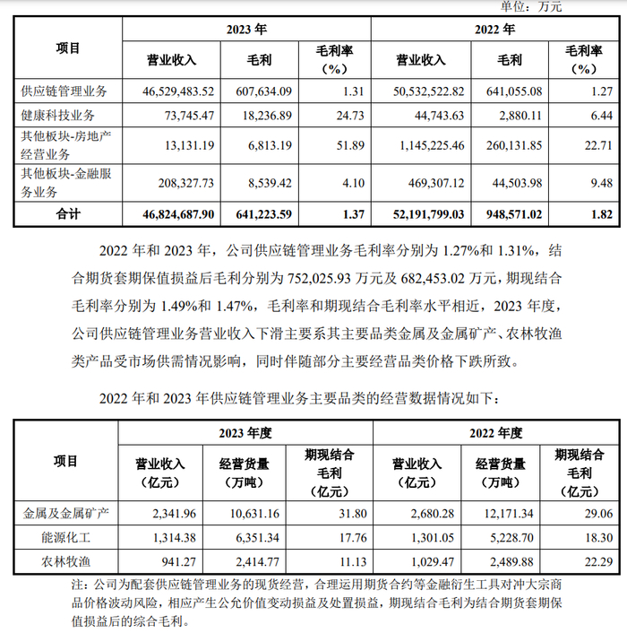 2023年和2024 年1季度,公司供应链管理业务营业收入占总营业收入的比例分别为 99.37%和 99.66%。2023 年度,公司剥离了类金融和金融业务,房地产业务在现有项目开发销售完成后也不再新增开发项目。因此回复中对供应链管理业务板块的主要产品销售量价、营收和利润变化、同行业对比情况等进行分析,具体情况如下: