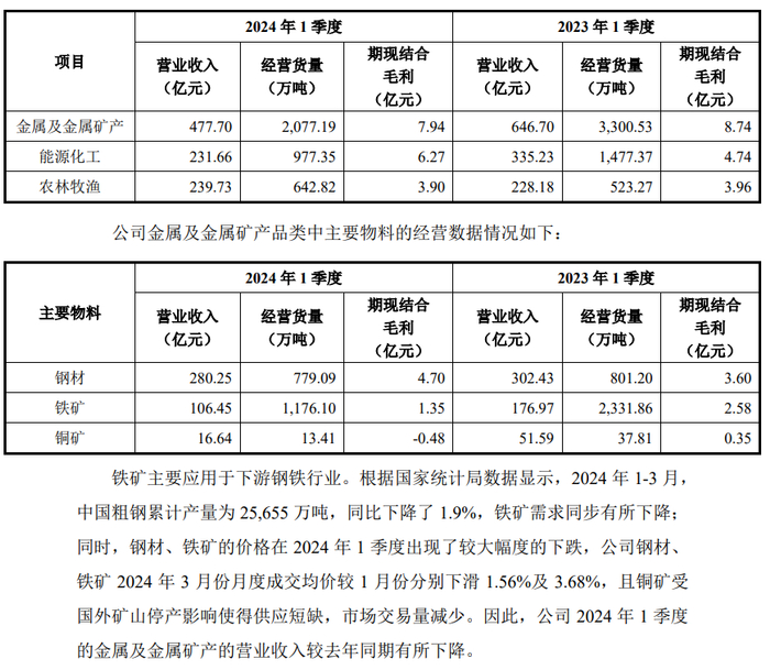2024 年 1 季度,钢材的期现结合毛利较去年同期有所增加,主要系 2024 年 1 季度钢材价格下降幅度较大,对应的钢材期货盈利较高所致。