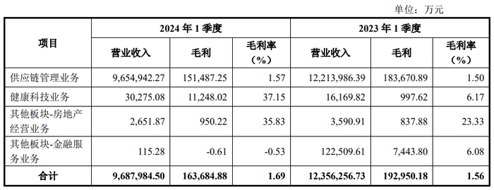 2024年1季度及去年同期供应链管理业务主要品类的经营数据情况如下: