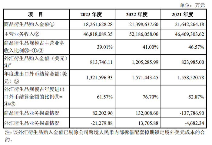 公司购买外汇衍生品系为配套供应链管理业务现货经营,防范外汇汇率波动风险而持有,与公司主营业务密切相关。剔除公司跨境人民币内部拆借配套掉期锁定境外美元成本的合约后,报告期内公司外汇衍生品购入金额分别为 823,985.00 万美元、1,205,285.99 万美元和 813,746.11 万美元,占公司年度进出口外币结算金额的比例分别为 52.87%、76.70%和 61.57%,与公司业务规模匹配。