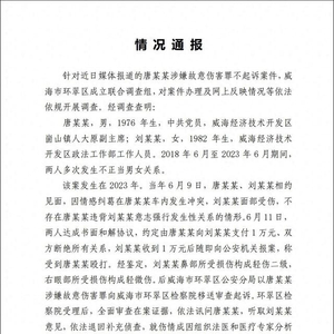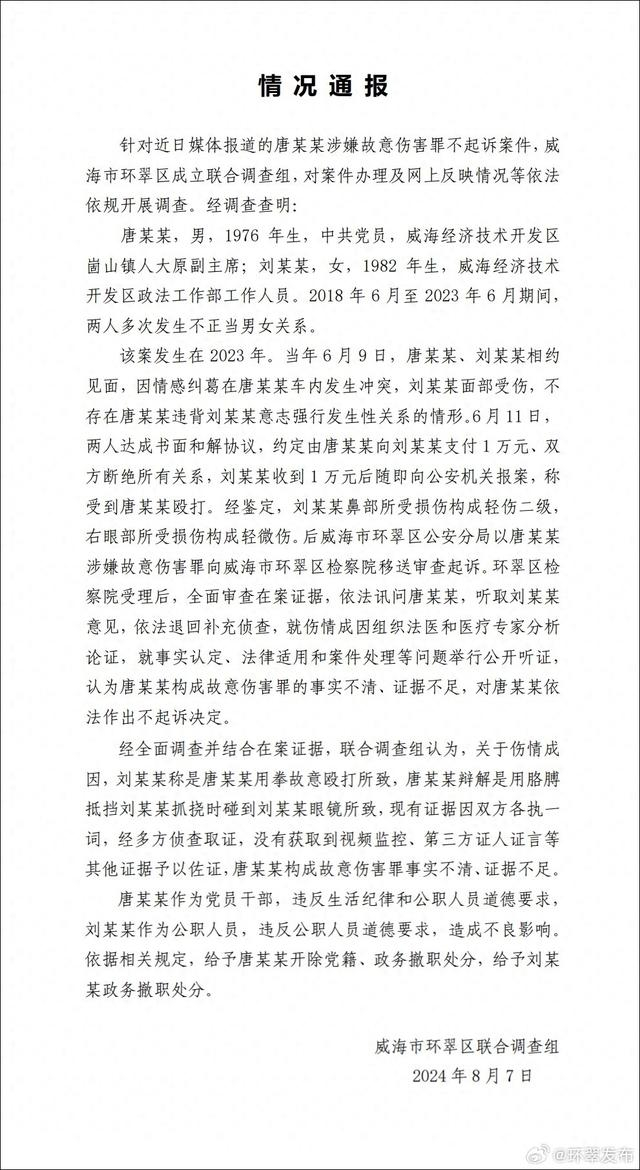 山东威海市环翠区融媒体中心官方微博(@环翠发布 )8月7日消息,针对近日媒体报道的唐某某涉嫌故意伤害罪不起诉案件,威海市环翠区成立联合调查组,对案件办理及网上反映情况等依法依规开展调查。经调查查明: