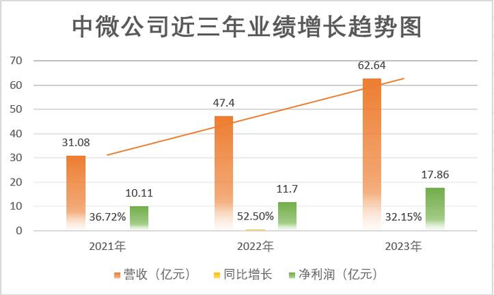 经过20年的发展,中微公司已经成国内半导体设备的领军企业,从这家公司最近三年的营收和净利润都能看到中国半导体设备需求的迅猛增长。从2021年到2023年,中微公司的营收分别达到31.08亿,47.4亿和62.64亿元,年复合增长率突破32%;这三年间,净利润分别达到10.11亿,11.7亿和17.86亿元,2023年净利润同比增长52.67%。