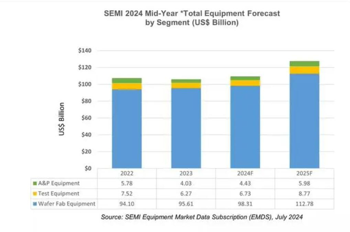 近日,国际机构SEMI最新发布的《年终总半导体设备预测报告》显示,2024年全球半导体设备总销售额预计将达到1090.4亿美元,创下历史新高。2025 年的半导体设备总销售额将重返快速增长轨道,将达到1275.3 亿美元,较今年预期数据大增16.5%。从区域来看,中国大陆2024年半导体设备支出将达创纪录的350亿美元,占全球总额约32%,稳居全球榜首地位。