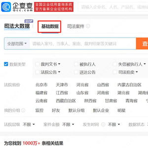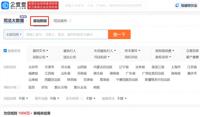 基础数据模块:用户可以按照案号、当事人、案由、裁判结果等方式通过聚合搜索,选择裁判文书、司法拍卖、被执行人、询价评估、失信被执行人、股权冻结、终本案件、破产重整、限制高消费、财产悬赏公告、立案信息、限制出境、诉前调解、开庭公告、法院公告、送达公告等想要查找的数据类型,同时可以对案件地区、法院层级、发生时间进行多维度筛选,查看精准结果。此外,该模块支持数据导出功能。