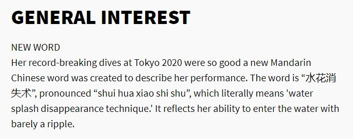 Her record-breaking dives at Tokyo 2020 were so good a new Mandarin Chinese word was created to describe her performance. The word is "水花消失术", pronounced "shui hua xiao shi shu", which literally means 'water splash disappearance technique.' It reflects her ability to enter the water with barely a ripple.她在2020年东京奥运会上的跳水成绩打破纪录,非常出色,人们甚至创造了一个新的中文词汇来形容她的表现。这个词是“水花消失术”,发音为“shui hua xiao shi shu”,字面意思是“水花消失的技术”,表示她在入水时几乎不会激起涟漪和水花。