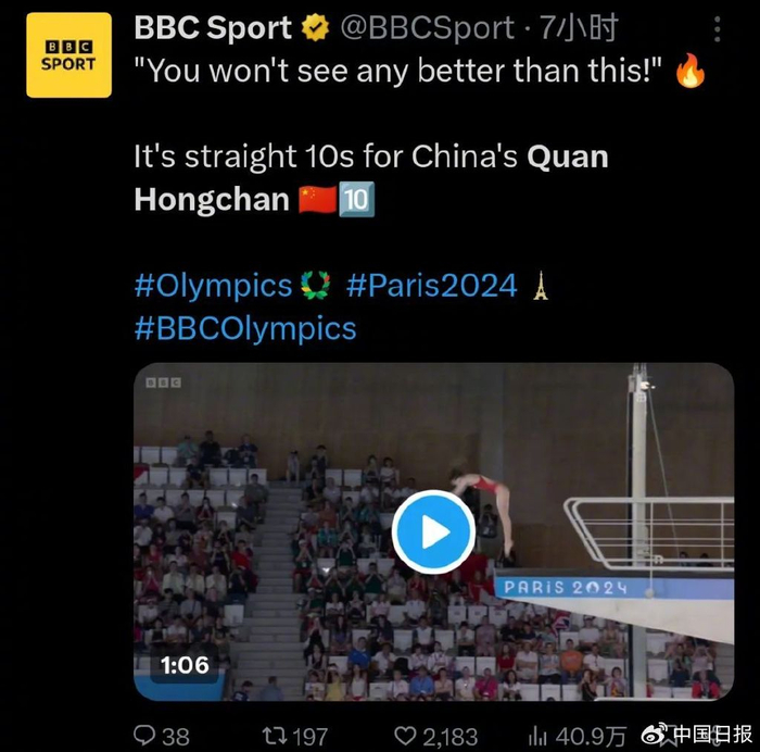 美国全国广播公司NBC在其报道开篇则引用了一句俗语:“不看你怎样开始,就看你怎样结束。”但是全红婵在第一跳后所有7名评委都给出了10分的满分,这样的开始是后来任何选手都无法超越的。