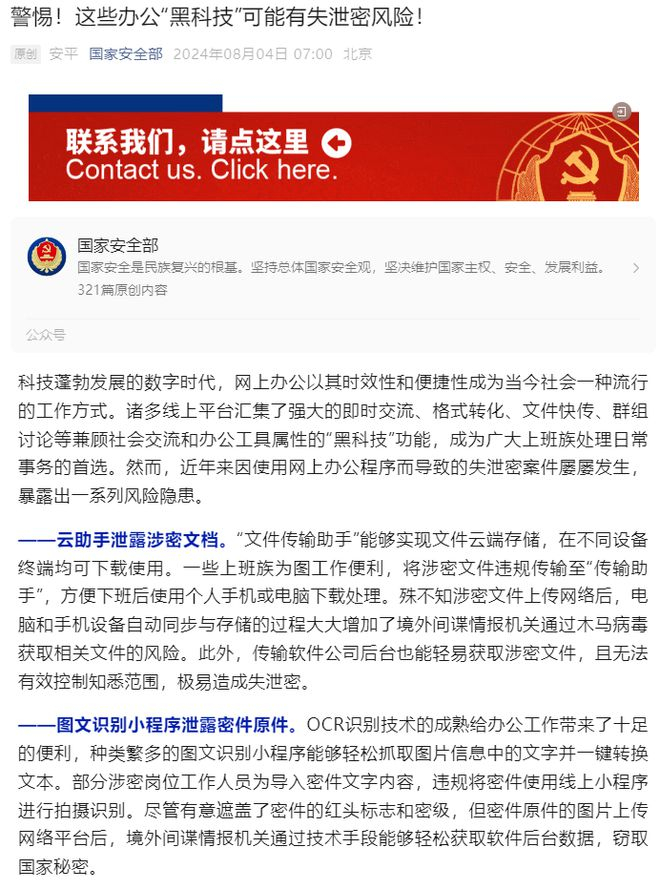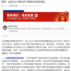 巧的是,国家安全部 8 月 4 日发文提醒:“文件传输助手”虽然能够实现文件云端存储、在不同设备终端下载使用,但这种方式存在多种隐患,极易造成泄密。因此,“文件传输助手或有泄密风险”迅速登上热搜。