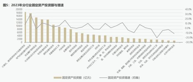 从绝对值来看,固定资产投资主要集中在电气机械等资本密集型行业。2023年制造业固定资产投资额合计达到17万亿元,其中固定资产投资额最高的行业是计算机通信行业,为1.8万亿元,其次是电气机械行业,为1.7万亿元。超过1万亿元的行业共有6个,合计占到制造业投资总额的52.9%。与此同时,也有9个行业的固定资产投资不足3000亿元。