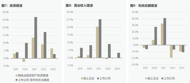 我们用“资本性支出”来衡量上市公司的投资规模,如图7所示,上市公司投资增速的变化趋势与制造业固定资产投资大致是类似的。此外,我们还给出了上市公司和规模以上制造业企业的营业收入增速和利润总额增速,如图8和图9所示,两组数据的大致走势都是一致的,我们利用上市公司的数据来挖掘我国制造业投资在细分行业上的差异。
