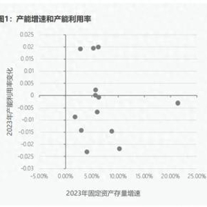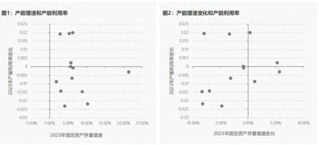 我们用2023年各行业产能利用率的年均值减去2022年的年均值,计算了2023年各行业产能利用率的变化,与产能增速、产能增速的变化进行比较,结果如图1和图2所示。无论是产能的增速还是产能增速的变化,都和产能利用率的变化没有明显关系。因此,我国产能的增长与产能过剩与否似乎没有明显的相关性。
