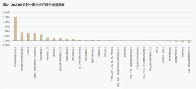 从对整体增速的贡献来看,电气机械行业的贡献也远高于其他行业,行业间的差异更加明显。2023年制造业固定资产投资增速为6.5%,我们将其增速拆分为不同行业的贡献,如图6所示。