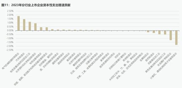 从增速贡献角度来看,上市企业的资本性支出在行业结构层面的差异是更大的。2023年增速贡献最大的仍然是电气机械行业,贡献了1.87个百分点的增速,单个行业的贡献甚至接近资本性支出增速的七成(1.87%/2.76%)。其次为汽车制造业,贡献了1.47个百分点。贡献最小的是计算机通信行业,为-1.84个百分点。