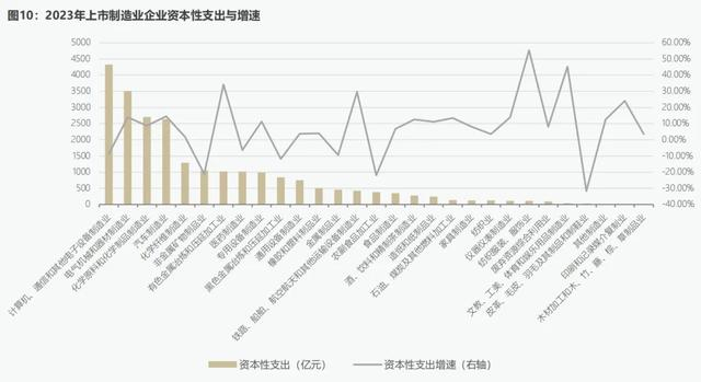从绝对值来看,资本性支出最高的行业仍然为计算机通信,达到4320亿元,其次为电气机械行业,为3500亿元,这一结果与制造业固定资产投资的数据是一致的。