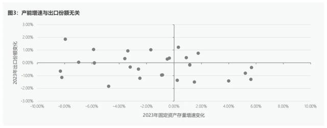 如图3所示,没有看到产能增速提高幅度越大的行业,其占世界出口份额的比重上升的幅度也越大。总体上,产能增速和出口份额的增长并没有直接联系。
