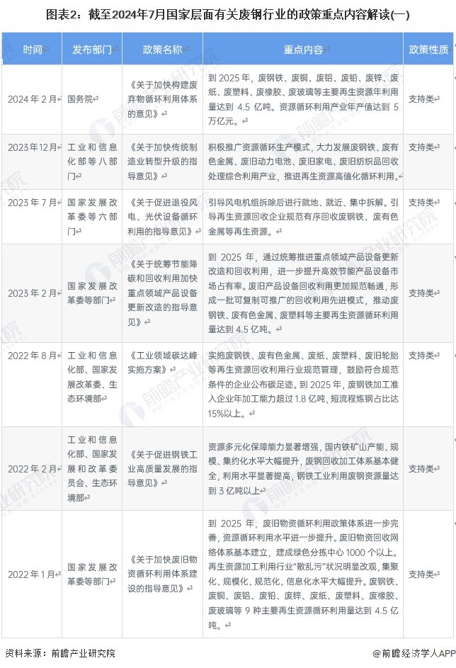 2024年2月,国务院印发了《关于加快构建废弃物循环利用体系的意见》,其中对我国废钢回收行业发展提出来明确规划与发展目标:到2025年,废钢铁、废铜、废铝、废铅、废锌、废纸、废塑料、废橡胶、废玻璃等主要再生资源年利用量达到4.5亿吨。资源循环利用产业年产值达到5万亿元等。