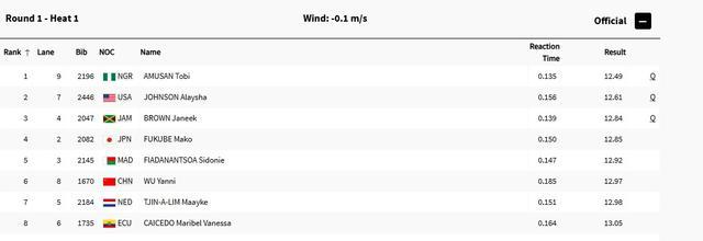 吴艳妮在比赛开始前对着镜头致意。直播截图本场比赛是吴艳妮在巴黎奥运会上的首秀,她所在的第一小组可谓实力强劲,同组选手包括来自尼日利亚的世界纪录保持者阿穆桑、美国名将约翰逊、牙买加名将鲍文以及今年亚洲最好成绩保持者、日本选手福部真子。发令枪响后,吴艳妮一度落后,她后半程奋力追赶,最终排名第6位,成绩是12秒97。排名第一的阿穆桑的成绩是12秒49,她和约翰逊(12秒61)、鲍文(12秒84)直接晋级,排名第四位的是福部真子,成绩为12秒85。