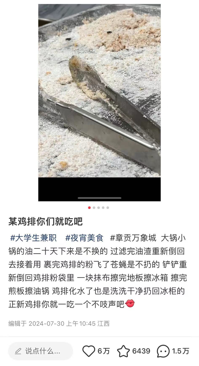 “油用了20多天不换,裹完鸡排的粉飞了苍蝇不扔,一块抹布擦完地板擦冰箱。”近日,有网友在社交媒体上发文称,其在江西赣州章贡区一正新鸡排门店兼职时发现,该门店存在多处卫生隐患。