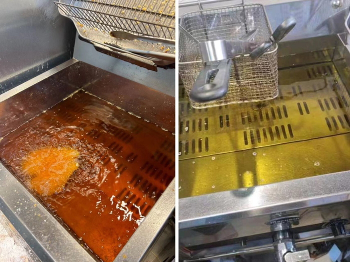 《消费者报道》记者随机采访7家广州地区的正新鸡排门店,有两家门店向记者提供了后厨的炸油槽照片,记者注意到,照片中声称门店换油频率为一星期的油色明显深于声称两天换一次的油色。