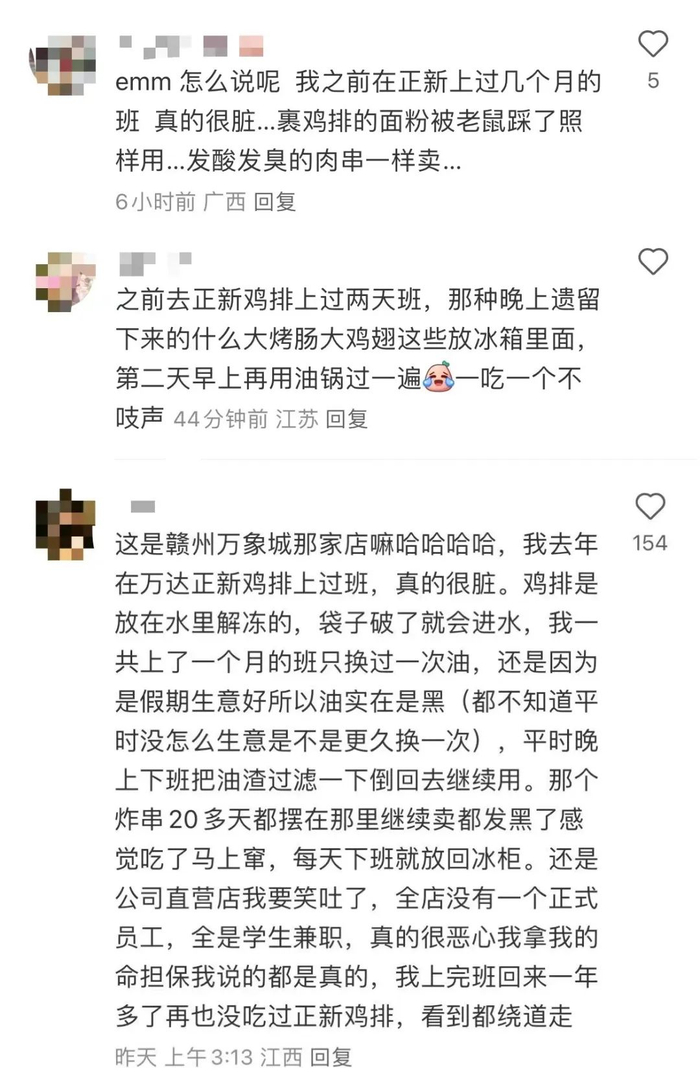 事实上,正新鸡排的食品安全问题在社交平台上早已有不少讨论,不少评论者称自己在正新鸡排门店工作时也曾看到了不少卫生乱象,如“裹鸡排的面粉被老鼠踩了照样用”,“一共上了一个月的班只换了一次油”等,也有消费者发图表示自己亲眼看见正新鸡排的店员将装满炸物的勺子随意放在垃圾桶上。