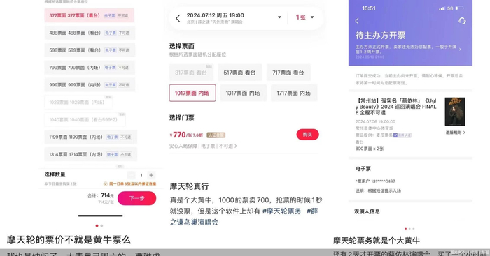 官方渠道显示“缺货”的凤凰传奇“吉祥如意”2024巡回演唱会呼和浩特站,摩天轮票务却各档位俱全,但内场1380元档位的门票在平台中已“炒”至6600元。每逢演唱会旺季,诸如此类的现象早已屡见不鲜。但消费者在高溢价购票后,却屡屡陷入无奈的境地。北京商报记者接到多名消费者反馈,在摩天轮票务入驻商家高溢价购票后,却遭遇出票慢、退票难、手续费高等问题。更有消费者直言:“本以为是正规商家,没想到竟是摇身一变的黄牛。”北京商报记者调查中发现,现阶段有专门的代理人可为用户提供“摩天轮平台商家资质代办”的服务,对方直言:“7500元即可完成代办,审核成功率100%。”