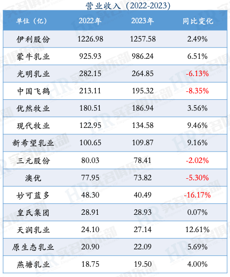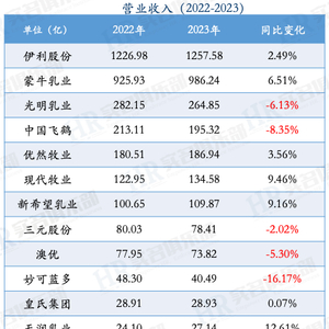 从营业收入来看,光明乳业、中国飞鹤和澳优有明显营收下降,蒙牛乳业旗下的妙可蓝多下滑最多,同比下降16.17%。