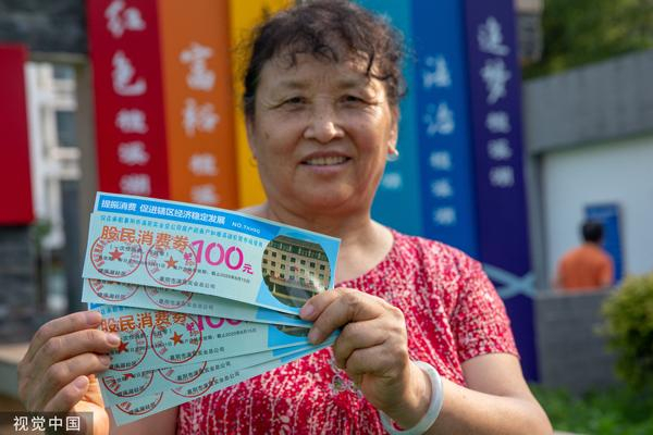 2020年6月25日,湖北省襄阳市,襄城区檀溪湖社区股民展示刚刚领到的股民消费券。视觉中国