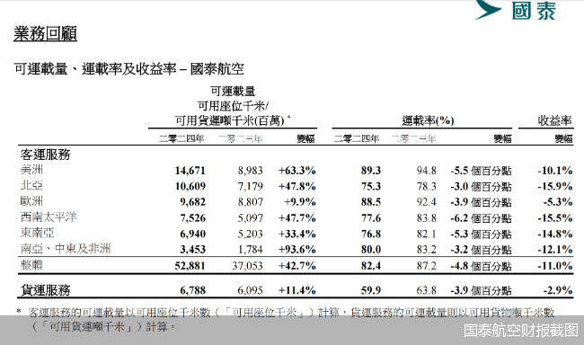 根据财报,国泰航空上半年整体运载率同比下降4.8个百分点,收益率整体同比下降11%。