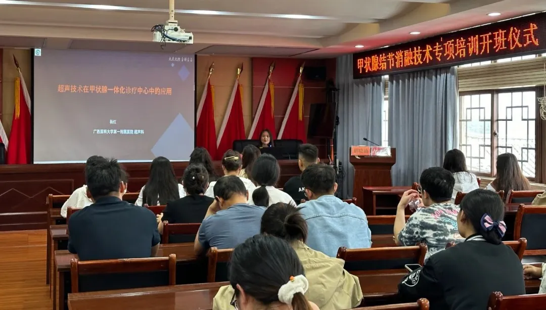 当天,杨红教授为多名甲状腺结节患者行微创消融术,并对甲状腺结节消融技术进行专题授课、经验分享。
