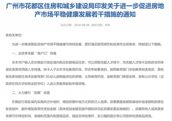 8月6日,广州市花都区住房和城乡建设局印发《关于进一步促进房地产市场平稳健康发展若干措施的通知》(下称《通知》)。其中,该《通知》因提到了买房享花都“准户口”待遇,受到了广泛关注。