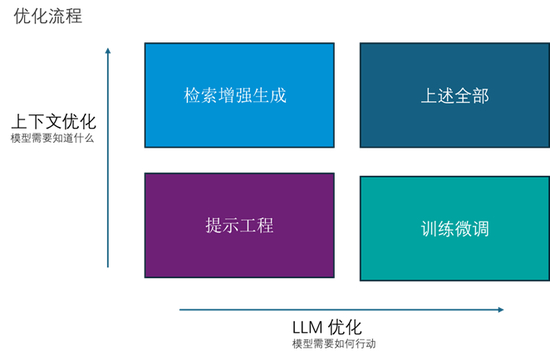在对大型语言模型进行性能优化的过程中,OpenAI采用了一种综合性的优化流程。如图2所示,该流程横跨了上下文优化(Context Optimization)与LLM优化两个关键维度。上下文优化关注于模型需要了解的信息,即为了成功执行任务,模型需要了解的背景知识。而LLM优化则着重于模型的行为方式,即模型采取的方法和行动来解决特定问题。